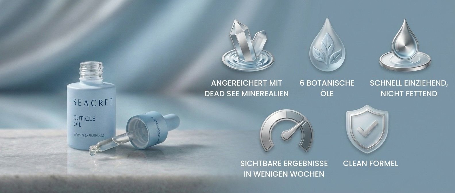 Reichhaltiges Nagelhautöl mit einer Komposition aus wertvollen Pflanzenölen, Vitamin E und mineralstoffreichem Wasser aus dem Toten Meer. Pflegt intensiv, beugt Trockenheit vor und unterstützt eine gesunde Nagelstruktur.