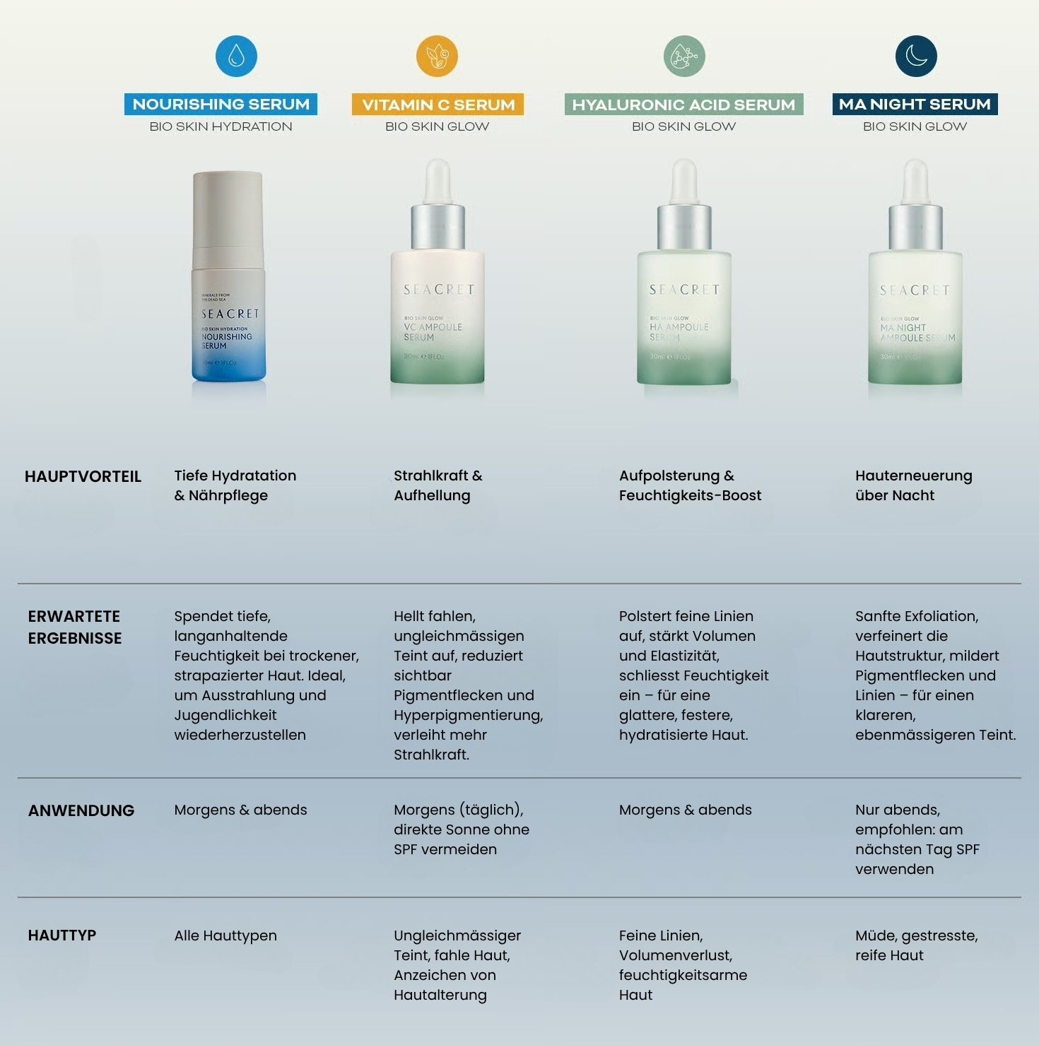 - Aloe Vera, Hyaluronsäure und Mineralien aus dem Toten Meer versorgen die Haut tiefenwirksam mit Feuchtigkeit.