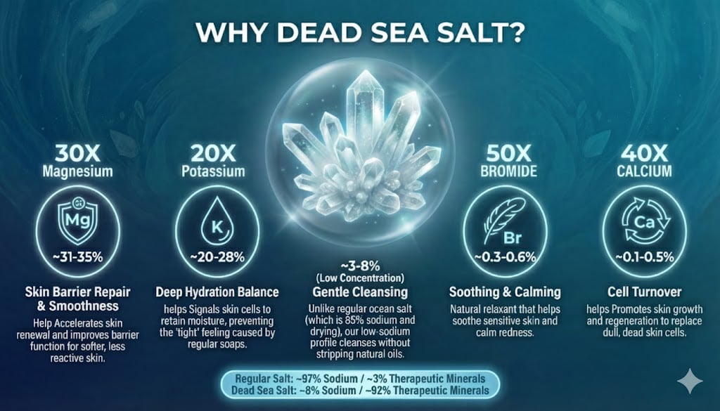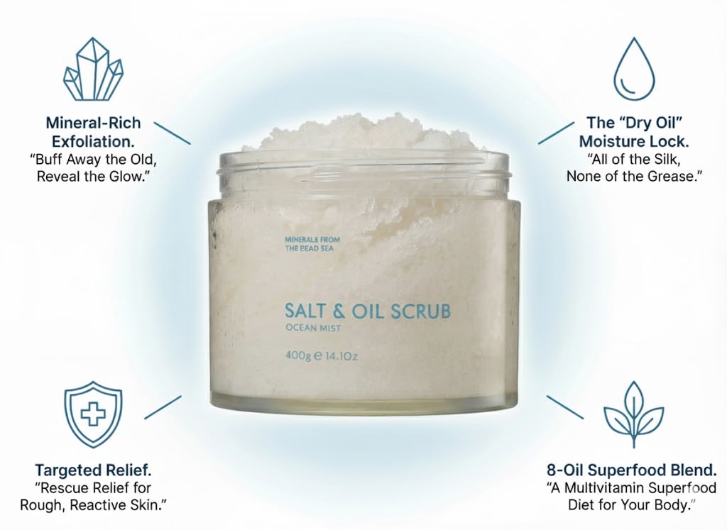 A luxurious blend of Dead Sea salt and nourishing botanical oils that exfoliates and softens the skin.